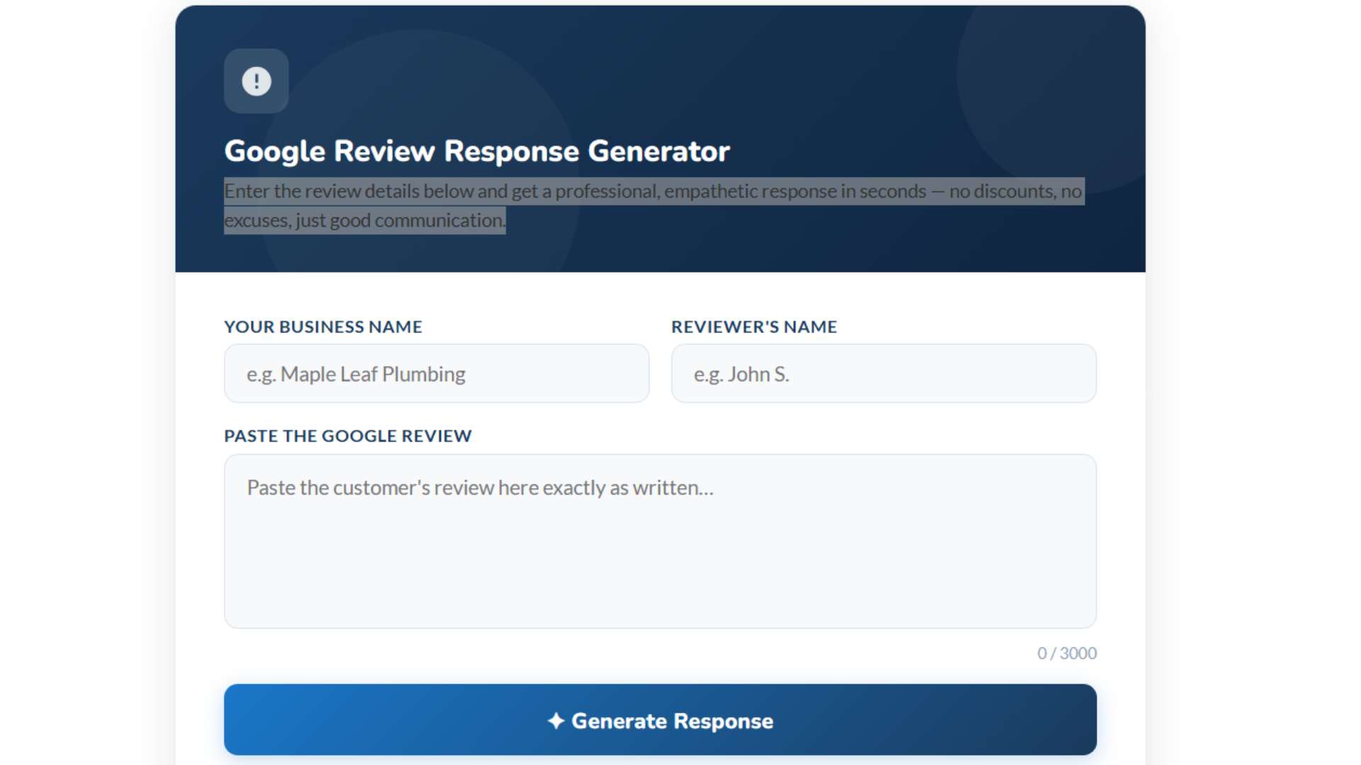 Enter the review details below and get a professional, empathetic response in seconds — no discounts, no excuses, just good communication.